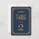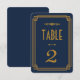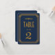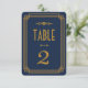 Estes números de mesa apresentam uma paleta de cores azul e dourado, uma moldura geométrica e outros detalhes estilísticos todos inspirados no Art Déco e nos loucos anos vinte. Você pode personalizar os campos de texto de amostra ao seu gosto.