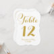 Este número de mesa de casamento sofisticado apresenta os nomes dos noivos em escrita inspirada em caligrafia e uma forma elegante de corte die com letras douradas emolduradas.