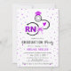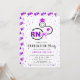 Nursing shool class of 2026 stethoscope purple RN graduation Invitation. This feminime girly graduation invitation features a black stethoscope with a graduation cap, a heart, a coquette bow, confetti and the initials RN in purple. The back includes a pattern of the 'RN" initials.