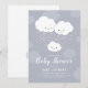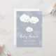 Personalize este Convite de Chá de Bebê de Casal Moderno e Elegante com uma família de nuvens fofas, composta por três nuvens brancas: pai, mãe e uma bebê, onde os orgulhosos pais-nuvem estão banhando seu bebê com uma chuva de corações cor-de-rosa em um céu cinza quente.