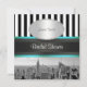 NY City Skyline BW Black & White Stripe Invitation Collection - Elegante de Chá de panela, na moda, convites personalizáveis de chic e acessórios com uma visão icônica do horizonte de Nova Iorque a a partir do topo do Rockefeller Center, com uma foto em preto e branco do Edifício de Ruas Emp, inferior Manhattan, incluindo o World Trade Center. Eles também apresentam um plano de fundo listrado preto e branco e uma fita aqua / lacre e preta, bem como uma etiqueta de gradiente branco com a sua escolha de uma imagem de cor prateada ou dourada. (Nota: alguns acessórios coordenadores de companhia podem não ter a foto ou os elementos adicionais de design.) Este produto faz parte de um conjunto de designs correspondentes que são facilmente personalizáveis para muitas ocasiões e eventos. Se você precisar de placas RSVP separadas, Obrigado, Notas, Carimbos, ímanes, etiquetas de favorecimento, cartões de escolta, etiquetas de vinho, menus, programas de eventos ou outros acessórios, por favor veja nossas outras listas. 2012 ©NYCisMyMuse