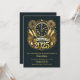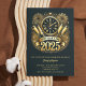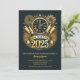 Festa de Véspera de ano novo Eletrônica do Convite NYE 2025 Personalizada. Convite digital móvel em cores pretas e Ouros com Fireworks, Champaign e Clicking Wall Clock Illustration.