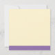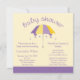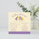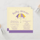 Convite muito doce do chá de fraldas com um guarda-chuva roxo e amarelo com corações e fitas em um fundo amarelo pálido.