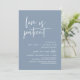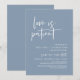 Este é o cartão de convite para Festas de casamento Reprogramado (adiado/adiado) (O amor é paciente), mude o cartão de data, no moderno e mínimo romântico simples tema azul empoeirado de design limpo. É a maneira perfeita de fazer o anúncio de reagendamento do evento para seus amigos e família.