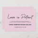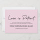 À luz de circunstâncias imprevistas, compreendemos que alguns casamentos podem ter de ser adiados. Comunique esta mudança com graça e positividade usando nossos convites de adiamento de casamento "Amor é Paciente". Esta placa personalizável permite-lhe partilhar os planos atualizados com os seus convidados e mantê-los informados. O design apresenta uma combinação de simples tipografia simples, preta e rosa-pincel, criando um estilo moderno e elegante. As palavras "Amor é Paciente" servem como um lembrete do amor duradouro entre você e seu parceiro, ao mesmo tempo que transmitem a mensagem de paciência e compreensão durante esse tempo. Personalize o cartão com seus nomes, data do casamento e quaisquer informações ou mensagens adicionais que você gostaria de incluir. Ao personalizar o cartão, você pode garantir que o convite reflita seu estilo exclusivo e captura o sentimento que deseja transmitir aos seus convidados. Embora a necessidade de adiar um casamento possa ser decepcionante, é importante abordar a situação com graça e positividade. Ao escolher nosso cartão "Mudança de planos", você pode entregar a mensagem do seu adiamento de casamento de uma forma atenciosa e atenciosa.