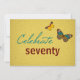 O convite moderno do aniversário do 70 do estilo caracteriza um salto alto projetado inteiramente fora das borboletas, as diversas outras borboletas, o papel de linho do olhar na parte dianteira e a parte traseira, e as áreas que você pode facilmente personalizar com os receptores nome do aniversário, a idade, e os específicos da festa de aniversário para a festa de aniversário especial do 70!