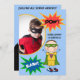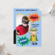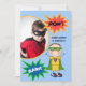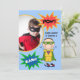 Um super-herói de cabelo triguenho do menino em um cabo verde e máscara nos convites triguenhos do aniversário do menino do super-herói dos miúdos que são fáceis de personalizar com específicos da foto e da festa de aniversário da sua criança! Se é um aniversário que do tema do super-herói está tendo, amará mandar este aniversário colorido convida!