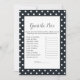 Aproveite este jogo de adivinhação do preço do chá de fraldas em um fundo preto com bolinhas brancas. Modelos para a frente, com um arco de bebê preto com fundo branco. Combina com a coleção Charming Black and White.