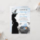 O convite apresenta uma bruxa, caldeirão e teias de aranha. Esta design é perfeita para um chá de fraldas de menino de Halloween.
