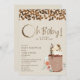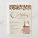 Chá de fraldas tematizado de café com o texto "Oh Baby!" com anel de café incorporado ao design com grãos de café e jarro de café frio tocado com chantilly chicoteada, chocolate, aspersas, caramelo e grãos de café à esquerda com design floral.