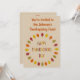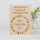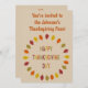 Este incrível convite para o banquete de Ação de Graças apresenta uma imagem de arte digital de uma série de folhas de Oak em tons de vermelho, laranja, amarelo e verde organizados em um círculo em torno de algum texto com letras alternadas de vermelho, amarelo, laranja e verde que diz Feliz Dia de Ação de Graças. Há texto personalizável na frente e atrás para que você possa personalizar este convite.