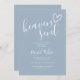 Um convite minimalista moderno para todos os chás de fraldas com um coração bonito desenhado à mão, código QR do registro e detalhes de eventos definidos com tipografia na moda num fundo azul empoeirado. Projetado por Thisnotme©