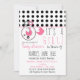 Um convite do chá de fraldas que caracteriza uma beira superior de bolinhas pretas com guarnição cor-de-rosa.  O pino cor-de-rosa da fralda unido à beira superior e o círculo dão forma com carruagem de bebê cor-de-rosa para dentro.  Personalize o texto cor-de-rosa e preto com detalhes de sua ocasião.