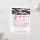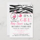 Um convite do chá de fraldas que caracteriza uma beira superior do impressão da zebra com guarnição cor-de-rosa. O pino cor-de-rosa da fralda unido à beira superior e o círculo dão forma com carruagem de bebê cor-de-rosa para dentro. Personalize o texto cor-de-rosa e preto com detalhes de sua ocasião.