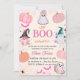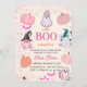 Rapariga Halloween Um Pequeno Convite De Chá de fraldas De Fantasma Boo Apresentando nosso Encantado Convite De Chá de fraldas De Tema De Halloween, onde abóboras adoráveis, chapéus de bruxas caprichosas, fantasmas amigáveis, poções mágicas, e um borrão de estrelas se reúnem para criar uma celebração inesquecível!