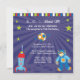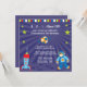 O convite de aniversário deste menino 5.25x5.25 tem um tema do foguete de espaço. Há um vôo do foguete e um astronauta com uma lua e as estrelas que flutuam toda ao redor. Você pode facilmente personalizar este com sua informação do partido no meio. Gráficos por estúdios de Blackleaf em MyGrafico