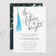 Cartão de modelo de convite para festa de formatura moderna com um roteiro de tipografia manuscrito que diz "o futuro é brilhante." Há uma ilustração de uma tassel azul-céu ao lado dela. Você pode adicionar a foto do formando na parte traseira da placa. Excelente para segundo grau e formando universitário.