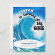 O convite para o primeiro aniversario do tema Oceano com grande onda azul de surfe, escrito com "[name] está transformando o grande" em uma tipografia retrô arrojada. O modelo está pronto para você personalizar os detalhes do convite, que no momento leu "pegar uma onda e parar para comemorar o primeiro aniversario dele..." e você pode editá-lo como quiser. O design tem uma paleta colorida em tons de turquesa, azul e verde oceânico. Por favor, procure na minha loja mais temas oceânicos, surfs e bebês em convites estilo conselho.