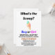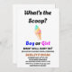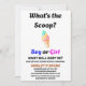 O gênero "What's the Scoop?' revela convite de festas. Este convite dá o tom de um gênero memorável que revela onde pessoas amadas e amigos se reúnem para revelar as emocionantes notícias do gênero do seu bebê. Sinta-se à vontade para personalizar/personalizar este convite ao seu gosto. Aproveite a revelação de gênero!