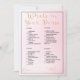 Entra num mundo de encantamento e riso com o jogo cativante "O que há na sua bolsa" - uma adição perfeita à celebração do seu chá de panela. Contra um fundo cor-de-rosa mesmerante, este jogo promete uma tarde cheia de camaradagem, surpresas e memórias alegres. A letra de escrita dourada "O que há na sua bolsa" convida os hóspedes a participar de uma encantadora aventura através das suas bolsas. À medida que desenterram tesouros ocultos, cada item revela seu próprio valor pontual, variando de 5 a 20 pontos. Essa reviravolta única em um jogo clássico traz um elemento de competição amigável e diversão compartilhada para o seu evento. Com foco na clareza e simplicidade, os itens do jogo são apresentados em uma fonte de bloco preto limpa, garantindo que todos possam participar com facilidade. As etiquetas "name" e "total", juntamente com as linhas que as acompanham, são enfeitiçadas com uma letra graciosa e cursiva de ouro, acrescentando um ar de sofisticação ao design geral. Enquadrada por uma fronteira negra clássica, o jogo "O que há na sua bolsa" exude uma elegância eterno que melhora a beleza do seu decoro chá de panela. Além do próprio jogo, essa experiência encoraja conexões entre convidados, ao compartilhar histórias sobre suas descobertas únicas. Elevem seu chá de panela com o jogo "O que está na sua bolsa", onde o espírito da aventura encontra a alegria da amizade. Este jogo é mais do que apenas entretenimento; é uma oportunidade de criar memórias queridas, celebrar laços, e adicionar um toque de elegância à sua celebração. Prepare-se para um chá cheio de risos, conexões e surpresas animadoras.