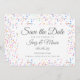 Romântico arco-íris confetti Salve o cartão de data. Personalize com seus nomes e detalhes em uma linda fonte de prata azul em um delicado fundo de confete arco-íris. Projetado por Thisnotme©