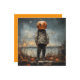 A imagem retrata uma figura em pé em um ambiente ao ar livre, vestindo um traje militar desgastado e robusto com botas. Em vez de uma cabeça, a figura tem uma grande abóbora esculpida com um rosto ameaçador e brilhante de jack-o'-lantern. O céu está nublado, dando à cena uma atmosfera sinistra, e o chão está espalhado com vegetação seca e duas pequenas abóboras, enfatizando o tema do Halloween. O estilo de pintura lembra a clássica Americana, evocando uma sensação de nostalgia e desconforto.