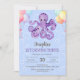 O convite para aniversários de criança bonitos apresenta um polvo e balões coloridos sobre o fundo do padrão das bolhas.