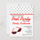 Uma festa na piscina convida a caracterização de uma beira de bolinhas pretas pequenas e da guarnição vermelha na parte superior. A ilustração de um par de óculos de sol vermelhos retros do olho de gato saiu no fundo. Personalize o texto preto e vermelho com detalhes de sua ocasião. O lado oposto é branco com as bolinhas pretas pequenas. Etiquetas de harmonização do porte postal e de endereço Look for no Paperie de Jill.