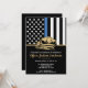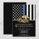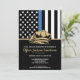 Este design apresenta uma bandeira das forças policiais com listras pretas e brancas, e também uma faixa com uma linha azul fina. O distintivo da polícia e o texto em dourado estão acima de todos os detalhes da festa para a aposentadoria do oficial de aplicação da lei, xerife, capitão ou chefe de polícia.
