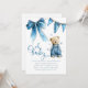 Set the scene for a joyful celebration with these blue jean baby themed baby shower invitations. Featuring an adorable bear in denim dungarees, a sweet denim bow, and playful blue stars scattered across a modern invitation template, they're perfect for honoring the parents to be.