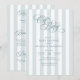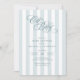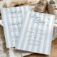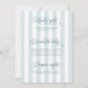 Convites de chá de bebê azuis e brancos elegantes e listrados, com um design de dois lados, oferecem uma maneira elegante e coordenada de celebrar o bebê menino a caminho. A frente apresenta listras verticais azuis pastéis suaves com um fundo branco crocante, lindamente combinadas com uma fonte cursiva graciosa para o título “Oh Baby” e texto serifado refinado para os detalhes do evento. A parte traseira continua o visual coeso, apresentando seções para informações de RSVP, um poema comovente “Livros para o Bebê” que encoraja os convidados a trazer um livro especial, e um convite encantador para um “Sorteio de fraldas” para uma atividade divertida e prática no chá de bebê. Perfeito para chás de bebê tradicionais para meninos, este design de convite tudo-em-um combina beleza, funcionalidade e toques sentimentais, criando um souvenir polido e