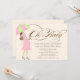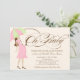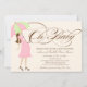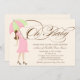 Este convite para chás de fraldas apresenta as palavras "oh baby" em um roteiro marrom elegante ao lado de um gráfico bonito de uma mulher grávida de rosa segurando um guarda-chuva verde rosa e claro. Graphics ©JW Illustrations.