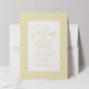 Um clássico ouro amarelo gingham enquadra este doce e simples convite de chá de fraldas neutro em relação ao gênero. Com texto personalizável, este convite para chás de fraldas gingham é perfeito para celebrar um menino ou menina no caminho. A parte de trás é um amarelo-sol coordenador com pontos brancos. Fornecimentos de chá de fraldas correspondentes também disponíveis na coleção de Lea Delaveris Design. Este convite para chás de fraldas também está disponível como download digital e em outras cores.