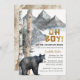 Celebrar a aventura de acolher um pequeno novo com este design de chá de fraldas. Apresentando um urso negro, pássaros, e a névoa negra das montanhas com cores enroladas sobre uma textura de mapa antigo, este moderno tema da floresta é perfeito para pais que amam o exterior. Personalize com os detalhes do seu chá para um evento exclusivo e inspirado na natureza.