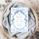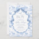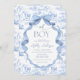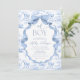Este Convite é uma fusão encantadora de elegância clássica e capricho brincalhão. Apresentando um delicado motif de Jouy em uma matiz azul de bebê macio, ele exibe lindamente animais safari estilo vintage — como elefantes gentis e girafas graciosas — aninhados entre intrincados elementos florais e botânicos. A linhagem fina e a paleta de cores tranquilas lhe dão uma estética de qualidade herdeira, perfeita para uma celebração eterno e sincera. Com uma fita azul graciosa e um arco, e aliado à tipografia refinada, este convite parece sofisticado e doce. Ele captura a maravilha de uma nova aventura enquanto honra a beleza tradicional, fazer uma maneira adorável de dar boas vindas a um bebê com calor e estilo. Itens correspondentes disponíveis.