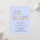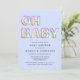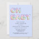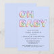 Este convite para o chá de um bebê moderno e azul bonito apresenta "OH BABY" composto por ilustrações de balão num arco-íris de pasta, azul, verde, rosa, roxo e laranja.