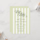 Cartões de convite para chás de fraldas verdes e listrados brancos, neutros do ponto de vista do gênero, oferecem um design eterno perfeito para celebrar uma nova chegada. Apresentando faixas verticais verdes e pastéis suaves em um fundo branco nítido, o layout destaca fontes graciosas de serif e script que criam uma apresentação sofisticada e animadora. O clássico cabeçalho de caligrafia "Oh Baby" desenhar atenção imediatamente, enquanto a tipografia equilibrada abaixo descreve claramente todos os detalhes do evento. Esse design personalizável exude encanto e simplicidade, fazer ideal para chás de fraldas tradicionais ou celebrações neutras em relação ao gênero. Perfeito para aqueles que buscam convites refinados para bebês com temas verdes suaves e elementos design minimalistas. Disponível como placas impressas ou um download digital instantâneo.