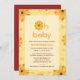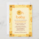 a design da frente mostra um belo convite para chás de fraldas em tipografia amarela e marrom e um texto "oh baby" no topo com uma flor dentro dela. esta design é bonita e será ideal para o seu chá de fraldas.