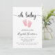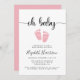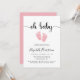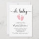 Um convite para chá de bebê magra, com "oh baby" num guião de na moda, com pestanas e uma cor de água rosada e pastel de pés de bebês. Por baixo você pode personalizar facilmente os detalhes do chá.