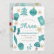 This cute "oh christmas three" boy's 3rd/third birthday invitation features a white background with christmas motifs, such as a tree, present, cupcake, bird, acorn, and ornaments in green shades. The reverse side features a light green background with Christmas tree motifs. Personalize it for your needs. You can find matching products at my store.