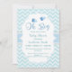 Esta aquarela nuvens oh menino bebê chá convite apresenta calçados de bebês em azul com padrão geométrico em cor verde de menta