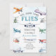 Celebrate your little aviator's big day with this wonderfully playful airplane birthday party invitation! Featuring a charming collection of watercolor aircraft — from commercial jets and vintage propeller planes to colorful helicopters — surrounding a bright, sky-blue "Oh, How Time Flies" headline. The soft watercolor style and airy white background create a fresh, cheerful look perfect for any transportation or aviation-themed birthday celebration.