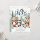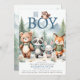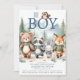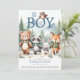 Um belo, mas elegante convite para chá de fraldas de menino com um tema de aventura na floresta, com uma ilustração aquática de adoráveis animais da floresta em equipamentos de caminhada, com mochilas e mãos dadas, caminhando nas montanhas. O título, "Oh Boy", com uma coruja fofa empoleirada nas cartas. Divertido e doce, ele vai colocar um sorriso nos rostos de todos e te preparar para cumprimentar seu pacote de alegria.