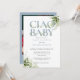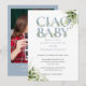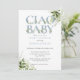 Convite de chá de bebê ciao com tipografia elegante em azul empoeirado e folhagem botânica verde e sua foto especial no verso. Criado por Thisisnotme©