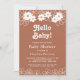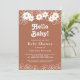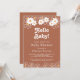 Este moderno convite de chá de fraldas neutro em termos de gênero é decorado com margaridas brancas e tipografia na moda num fundo de ferrugem de terracota.