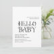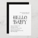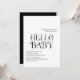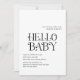 Convite para chás de fraldas moderno com um layout mínimo com "Hello Baby" em tipografia ousada no meio. Todos os elementos de design estão em preto-e-branco e podem ser alterados na ferramenta de edição de design. Este simples mas elegante convite para chás de fraldas é neutro em termos de gênero, fazer excelente para um rapaz ou chá de fraldas de menina.