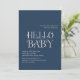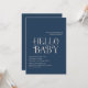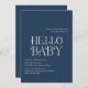 Convite para chás de fraldas moderno com um layout mínimo com "Hello Baby" em tipografia ousada no meio. Todos os elementos de design estão em azul e marfim marinho empoeirado e podem ser alterados na ferramenta de edição design. Este simples mas elegante convite de chá de fraldas é excelente para qualquer estilo de chá de fraldas de menino.