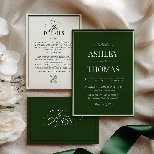 Refined, timeless, and effortlessly elegant, this wedding invitation features a rich old-money dark green paired with a soft ivory background. The clean typography and classic border design evoke understated luxury—perfect for couples drawn to heritage style, quiet sophistication, and enduring romance.