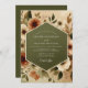 Embrace a warm, earthy aesthetic with this vintage-inspired botanical design. A sophisticated palette of deep olive green is complemented by painterly terracotta, burnt orange, and cream florals. Lush arrangements of anemone-style blossoms and delicate foliage create a rustic yet elegant atmosphere for your special day.