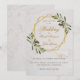 Este design de casamento para um tema de casamento de ramo de oliveira combina várias tendências: geométrico, mármore e metálico (dourado). O fundo é mármore branco. Possui ramos de oliveira com folhas verdes e azeitonas pretas para cima e para baixo à esquerda, sobre uma moldura hexagonal dourada irregular. O texto dentro da moldura dourada é dourado, o texto abaixo é preto. A palavra Casamento e os nomes são escritos em uma elegante caligrafia dourada.